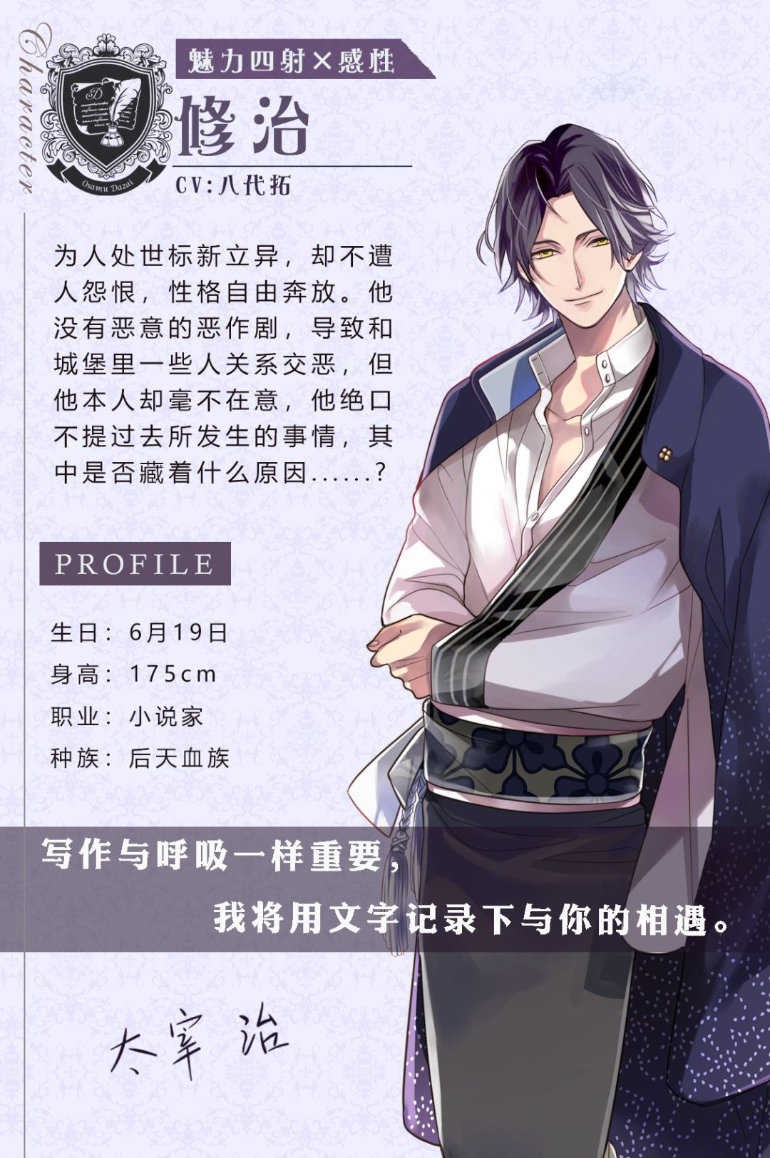 为人处世标新立异的修治,性格也十分自由奔放,同时也是城堡里的气氛制造者,但看似侃侃而谈的他,却绝口不提他过去所发生的的事,其中隐藏着的原因又是什么....?这一切等你亲自来城堡探寻吧~