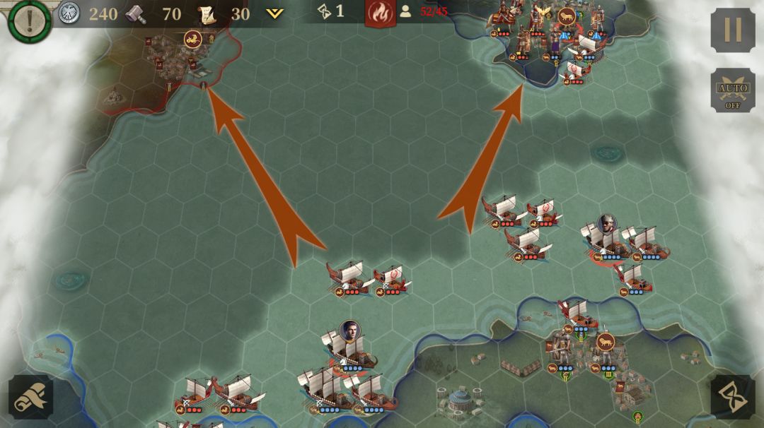 本关目标是守住2支关键部队,击败18支敌军,人口不低于20。本关看似是海战关,但可以利用剧情在陆地打海军。首先红圈部队被击败后,埃及艳后会向陆地撤退,我们先守住她的右翼,等触发剧情后向陆地后撤,守住海岸线拿人头即可。