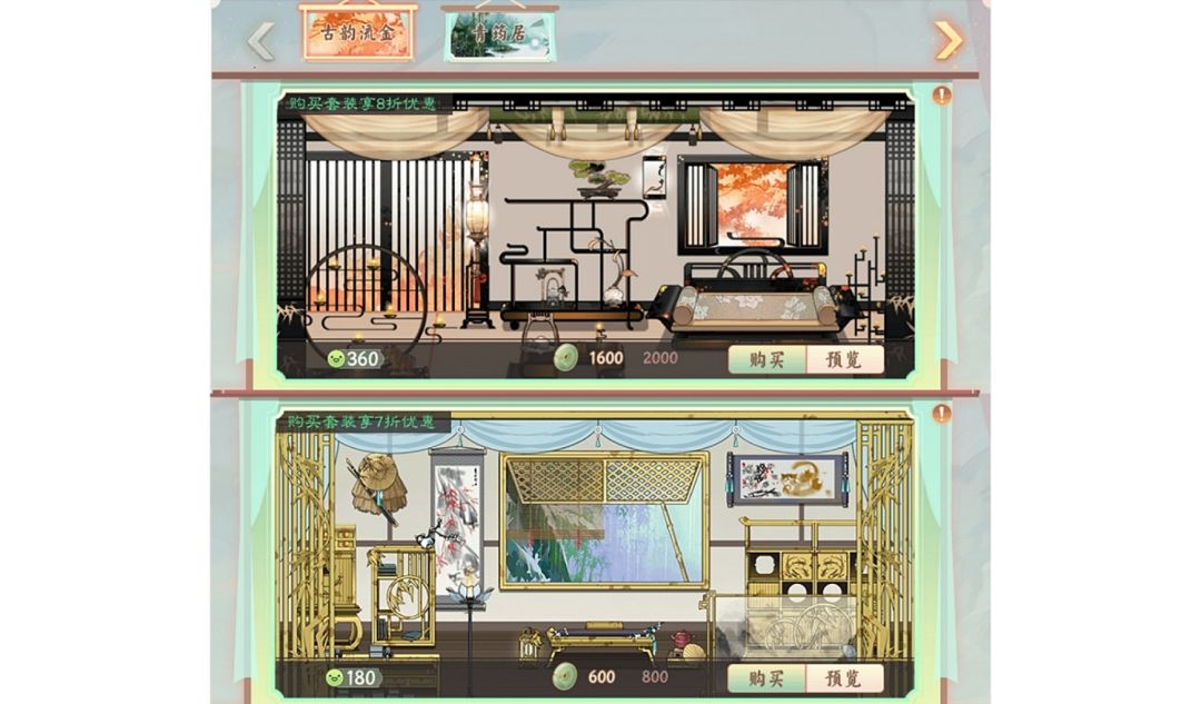 🔆总结:套装中【青筠居】性价比更高(然而总舒适度远低于古韵流金),单件中独玉购买的比资材购买的大部分的性价比高1倍,然而资材中的例外家具比独玉的性价比高1倍