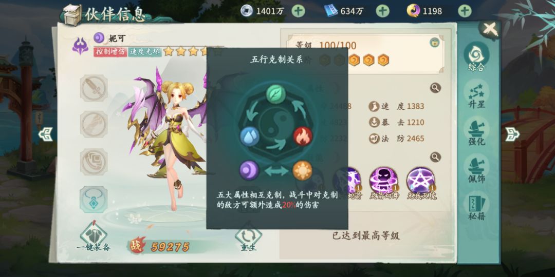 五行克制关系为木克水、水克火、火克木、阳克冥、冥克阳,木水火三个属性相生相克,而阳和冥属性互克。战斗中选择克制敌方的属性将额外造成20%的伤害。