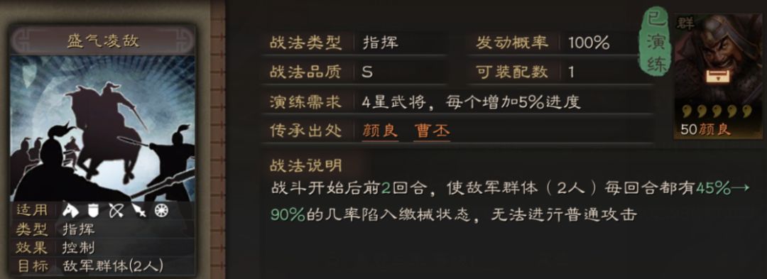 指挥战法【盛气凌敌】:战斗开始后前2回合,使敌军2人每回合都有几率陷入缴械状态,无法进行普通攻击。