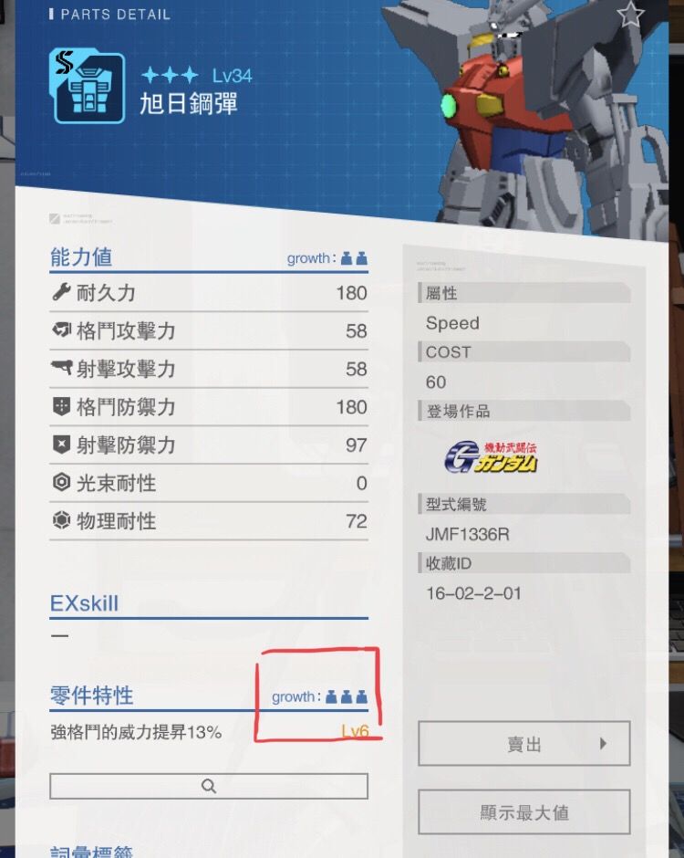 說一下其實這遊戲的零件區分強度概念 其實每一個零件裡面都有一個growth數值(可以簡稱g)意思就是零件的增長值 g越多證明升級的時候增長潛力越大 數值也越高 其實這才是區分零件強度的重要指標 每個零件一共有growth1到growth3(g3才是最強的) 經過我的研究 發現只有原生四星的紫才有g3 而且還是雙g3 如圖可見