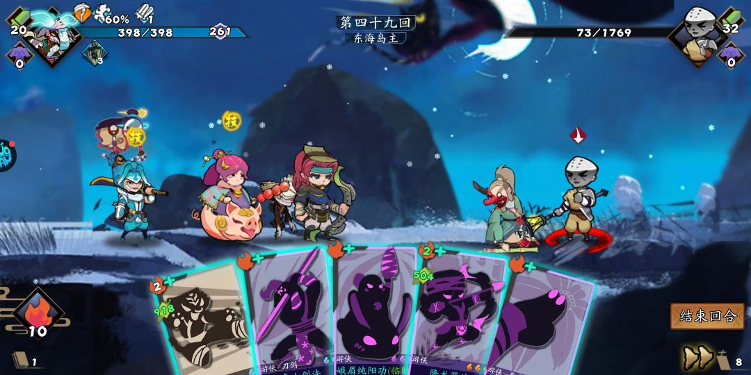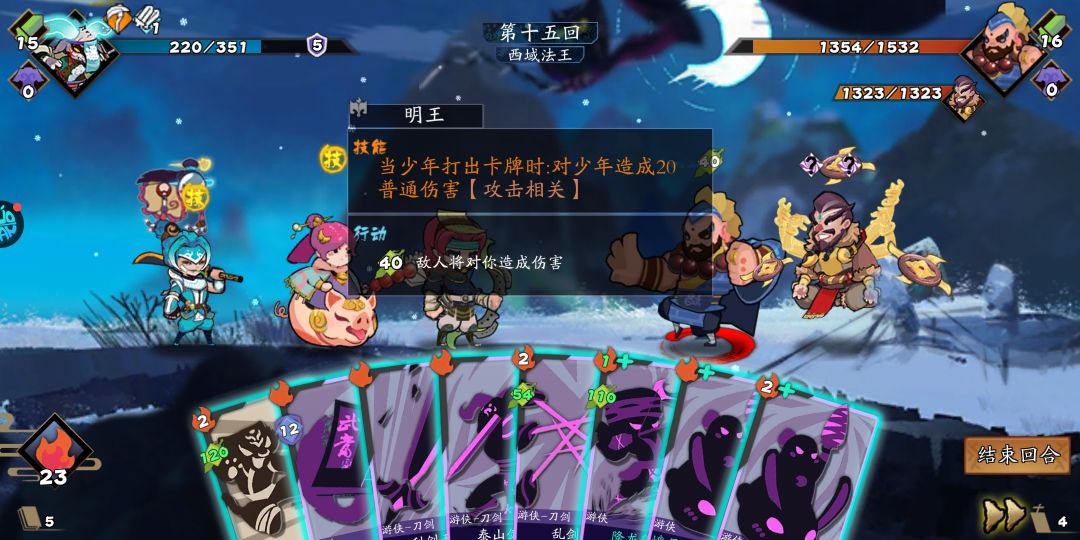 这把我是18怒气出门,有点少,22-23怒出门应该不难。打法就是用卡牌组合堆怒气或减少怒气使用,然后不停丢降龙箭法跟峨眉纯阳功打伤害。