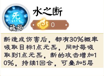 水系boss·断——造成伤害后,有30%概率吸收对方一点元炁。同时,每吸取到一点元炁都可以提高断10%的攻击,持续1回合,可叠加5层。