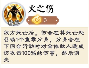 火系boss·伤——敌方角色死亡时,伤会在其死亡处召唤1个重零分身,分身会在下回合行动时对敌方全体造成伤攻击100%的伤害,然后消失。