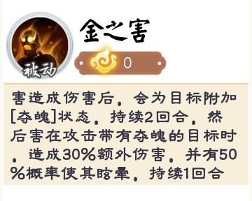 金系boss·害——造成伤害后,会为目标附加[夺魂]状态,持续2回合,然后害在攻击带有[夺魂]的目标时,会造成额外30%的伤害,并有50%概率使其眩晕,持续1回合。