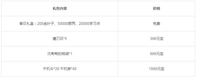 活动一:活动期间将限时上架春日礼包,礼包内容如下: