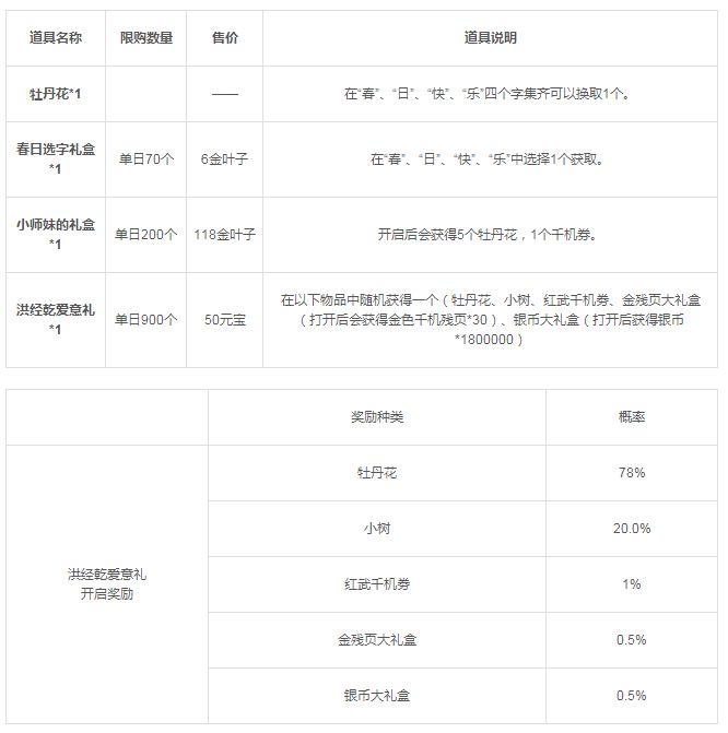 除此之外,大侠们还可以选购“小师妹的礼盒”与“洪经乾爱意礼”,以优惠的价格获得小树以及红武千机券、金残页大礼盒等道具。
