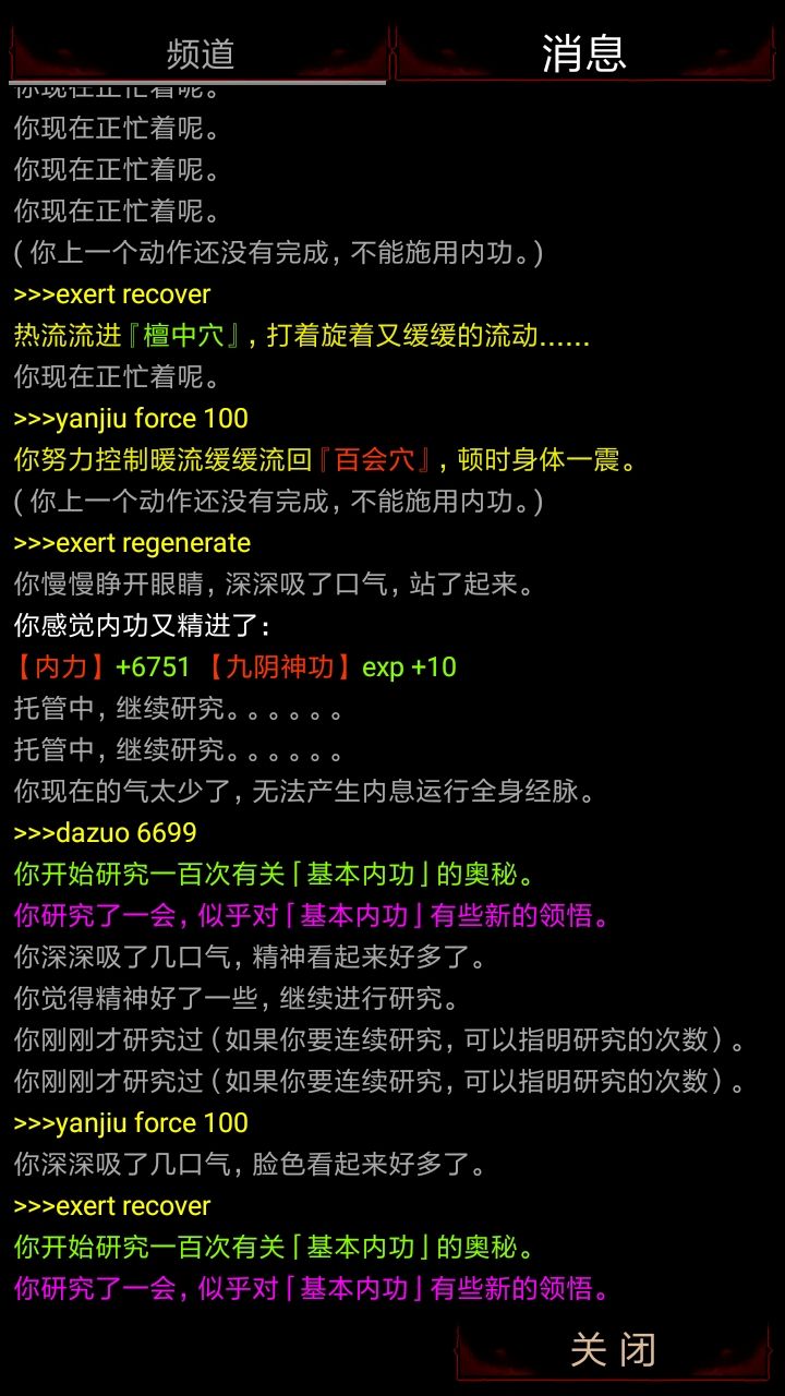 效果图大概是这样,最后挂机在闭关室然后磕天香使用。练功指令dazuo xxx(血气数,最好在一半左右);lian 基础技能id 次数(要在自己能承受的最大范围内,不然就会如下图,无法衔接上)
