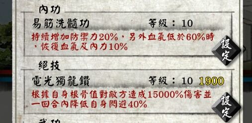 游戏已通关,发帖留念。深水爬山可以刷最大生命值,上限9999气血,附图两技能是图二和少林寺那张图出(我也是运气好,技能出得早,这两个技能用到结束无压力),江湖历练500出东方至尊头衔。。。每张图优先刷到掌门推荐就换图刷,100完成度想多了。。。这游戏对强迫症玩家很不友好。。。