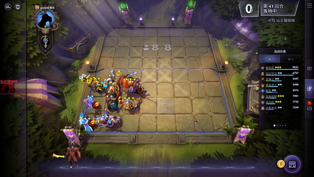 地精一般只玩到8人口,除非决赛圈有人跳十我们再考虑上9,阵容基本就如图了,龙骑可换,7人口四好斗+三法就已成型,8人口可上的棋子:飞机>炸弹人>两星龙骑>2星修补匠>任意法师