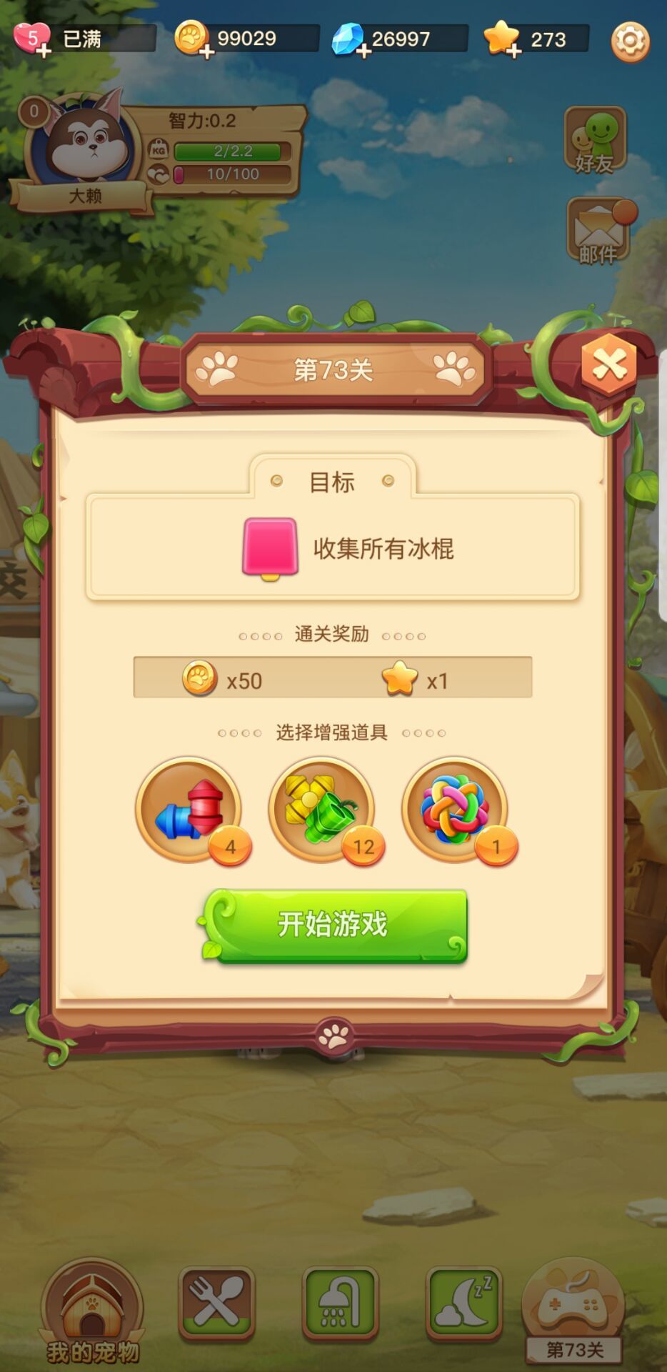 作为一个三消玩法的养宠游戏肯定是以消除玩法为基础,每完成一关三消关卡后会获得一定的“游戏金币”“星星”