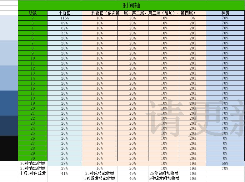 表中因为要平衡神魔的空档期和持续5秒的怒气爆发时间,这里统一都按照有怒起手来算,并且怒气持续时间是25秒。30秒输出收益是给大家一个参考。并且爆发特色的十握套还有5秒内爆发区间的平均buff收益。可以看出,我这拉魂怪,如果带十握套,5秒内爆发平均buff收益41%技能伤害,25秒区间是29%技能伤害。辉夜套是25秒内享受49%技能伤害及10%附加伤害,10%CD的buff。由此可见,对于我个人而言,辉夜套会比十握套理想。(其实神魔也棒棒。)