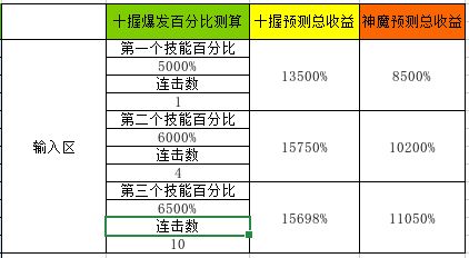 这个算法是针对大量连击职业的,但是有些职业,比如天诛,比如狂刀,爆发阶段的连击数不会太多,且爆发技能多为少连击段数技能,这样显然用这个表格计算平均值就不太讲究了,为此我做了一个针对该类职业的简单计算表格。表格的设计理念也告知大家一下,就是一个技能比如觉醒技能百分比是6000%,总计4hit,那么每hit分享百分比为6000%/4=1500%。(只能这样参考,因为很多职业技能百分比并不是这样计算的。参考,参考。)然后每hit减少3%的首饰buff收益,既170%,167%,164%和161%。1500%*(100%+170%)+1500%*(100%+167%)+1500%*(100%+163%)+1500%*(100%+161%)=15930%总技能百分比收益。然后言归正传吧,看下图。这是我们假设带入狂刀的模型看一下。假设狂刀新技能1hit(连击数),技能百分比5000%,觉醒4hit,技能百分比6000%,另一个觉醒10hit,技能百分比6500%。