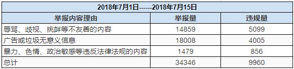 七月前二周的总举报量为34346条,实际处理量为9960条,举报成功率较为29%,变化幅度不大。举报总量较六月下半月小幅上涨12.1%。