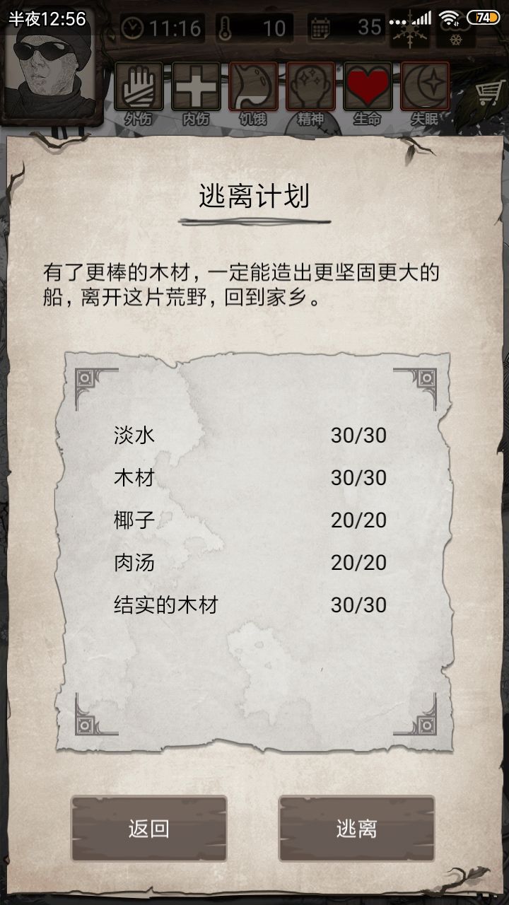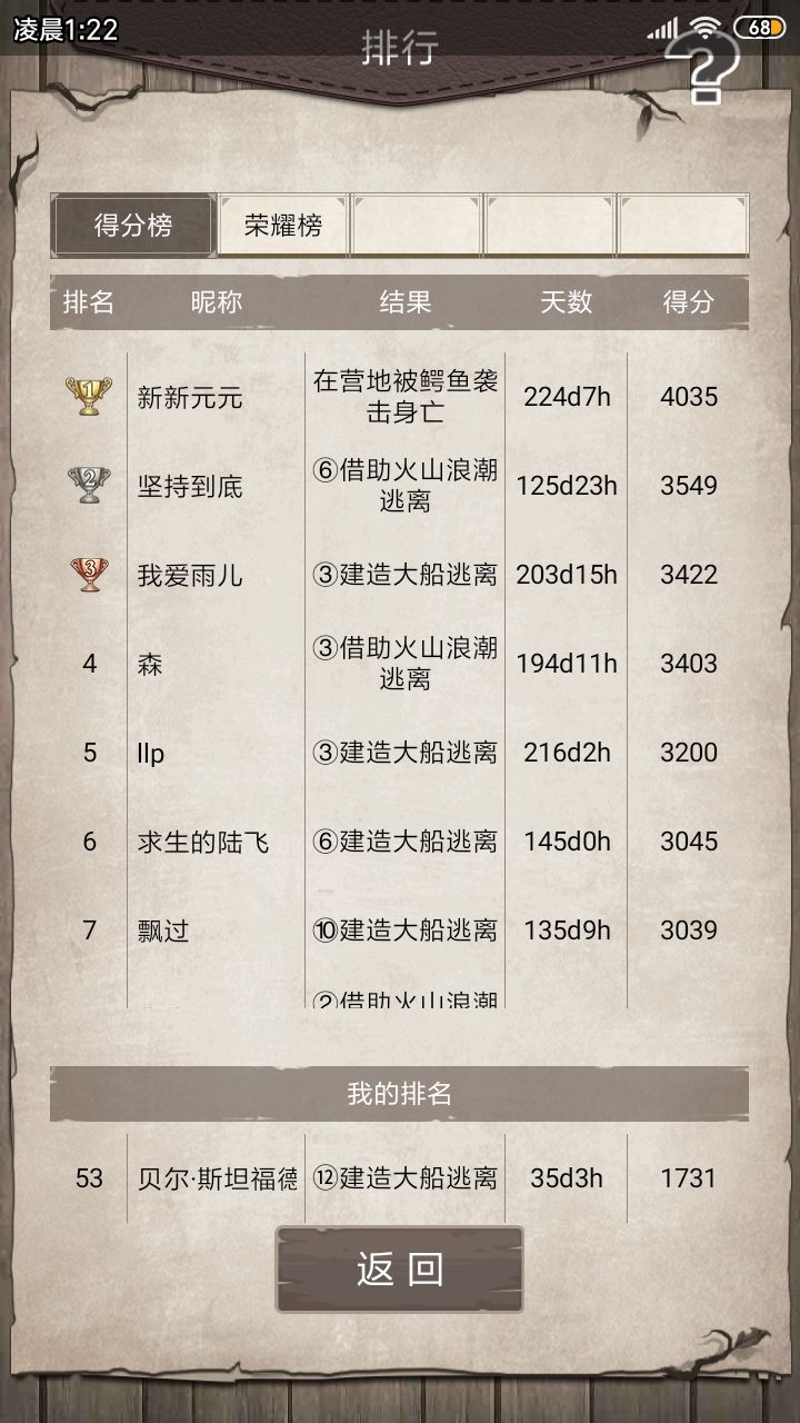终于,过了挑12mmp辣鸡卡车狼天天偷我东西,尤其是最后几天,我是精打细算的,所有逃离物资都是正好的,结果tmd净偷我水,肉汤,椰子,木头之类的了,第34天晚上我断网卡夜袭,从0点左右一直卡到0.40左右,40多分钟啊,是真的难受,所有建筑除了床和仓库,全烂了,1星夜语者也不好使,卡了40多分钟夜袭总算没有丢逃生物资的了。其次是迷路,薄雾冥冥迷路到怀疑人生,白板的占星师不好使,迫不得已升级成了1星才算好了点,但还是会迷路。战斗方面还好,感觉不是很吃力,可能我打的太保守了。累计消耗贝壳大约在7000左右(不算十连)主要消耗在迷路死了复活上了其他方面的消耗不多,大多在于买材料还有很大的提升空间,贝壳消耗可以减少到3000左右。