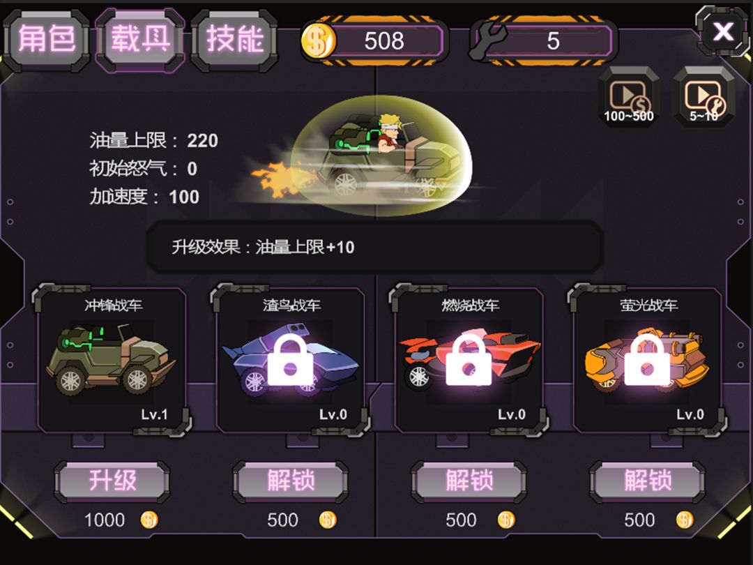 游戏有简单、困难、噩梦三个游戏难度,分为挑战模式和无尽模式。在游戏中,玩家可以根据金币解锁战车和人物。