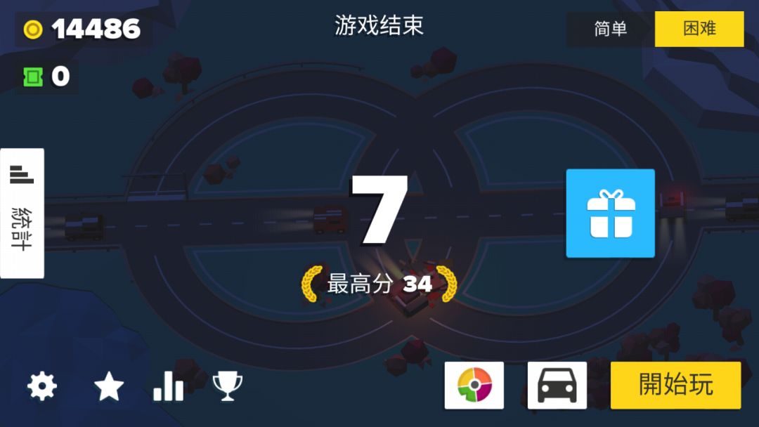 每局游戏,撞车后,出现的结算页面中有免费礼物。可以开出100金或者未解锁的车子。
