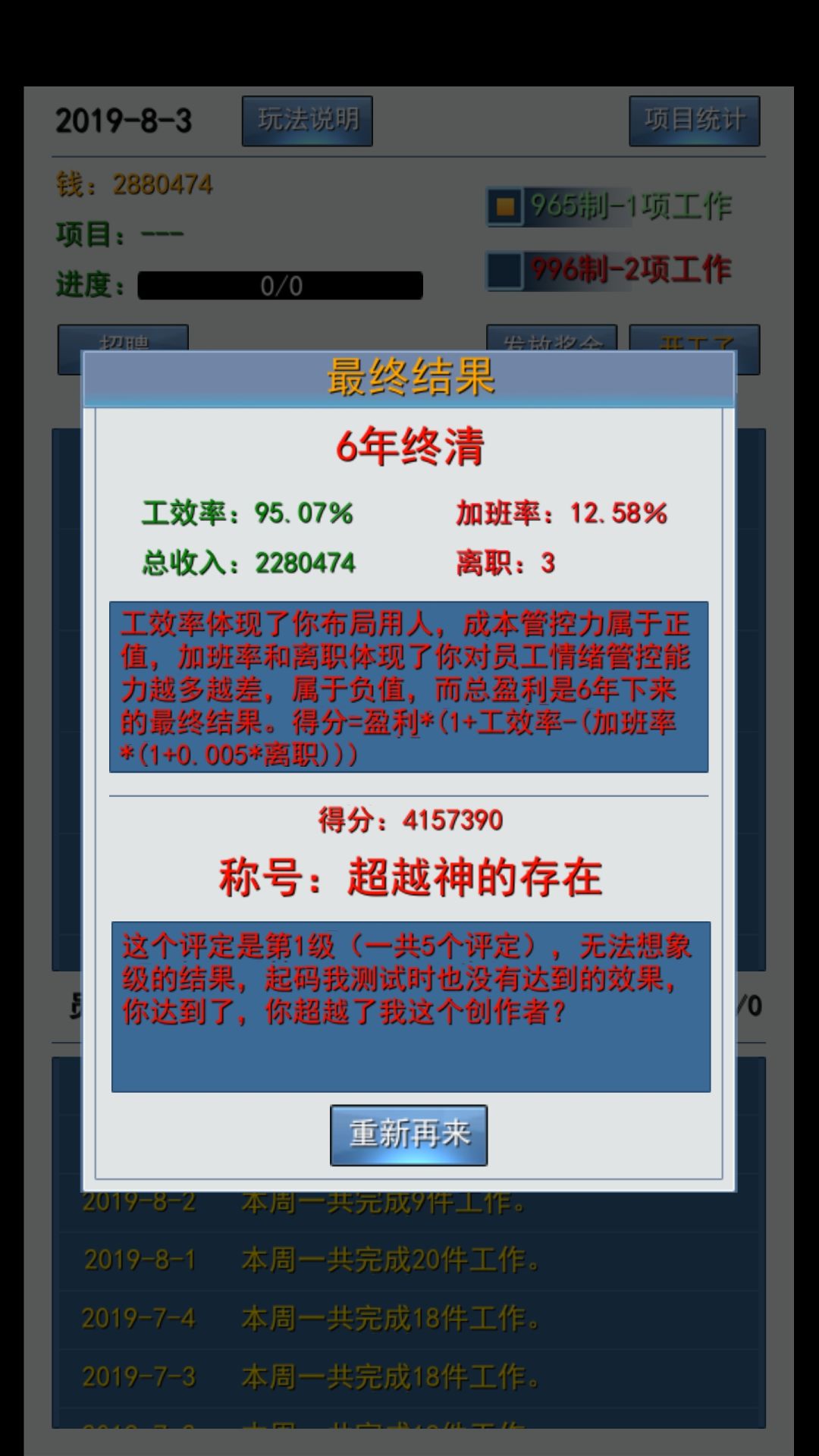 第一把破产,第二把无能的执行者。。。终于超神了。。。全程965,偶尔加个班。起初先用便宜的员工,注意看工作需要能力值以及人数等来招聘,只招抗压50,因为965不会离职,后续项目需要的员工能力变高,裁掉低能力的人,招聘合适能力的员工,觉得进展太慢也可以两天965,一天996这样来。