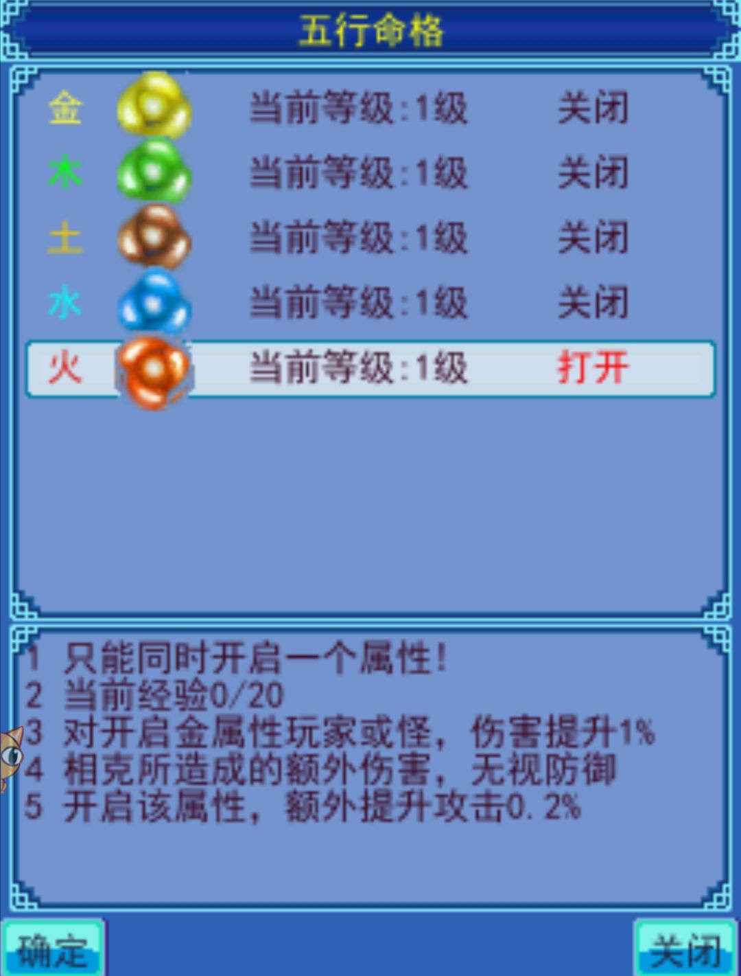 最后副本,建议组队或者找大佬带你。50级后多打打蓝紫装备就能自己做了。还有一个五行,五行界面在背包界面武器旁边的位置按确认打开,由于游戏内怪物大多都是金属性,所以选择火属性克制金属性可以无视防御刷怪更轻松。另外每个五行会带来人物属性额外加成,火属性是攻击加成,所以比较常用。