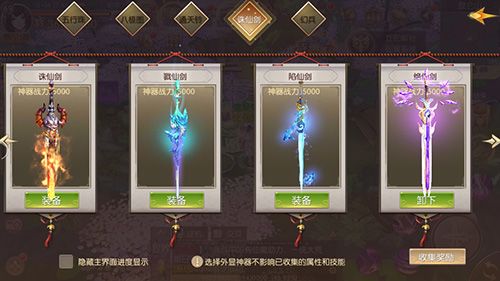 《风之剑舞》中的神器分为五行珠、八极图、通天铃、诛仙剑、幻兵五大类型。在各大类神器下又分出了不同神器,比如在诛仙剑神器下面分出了诛仙剑、戮仙剑、陷仙剑、绝仙剑四种神器,每件神器都具有独特的造型,收集之后,可以根据自己的偏好佩戴他们上阵。