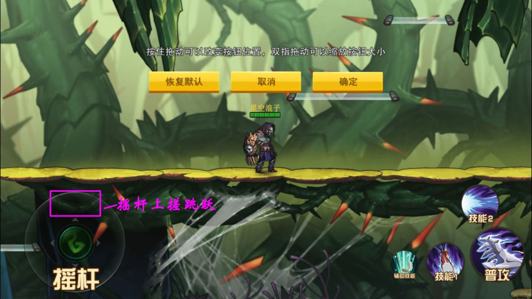 选择这种模式,左侧移动摇杆的上键将拥有“跳跃”的功能,而下键将拥有“下跳”(即下跃一层)的功能,右侧的“跳跃”键将被取消。其好处就是更容易在跳跃的同时来攻击敌人,但也容易误操作,比如在前进的时候不小心触发到了前跳。