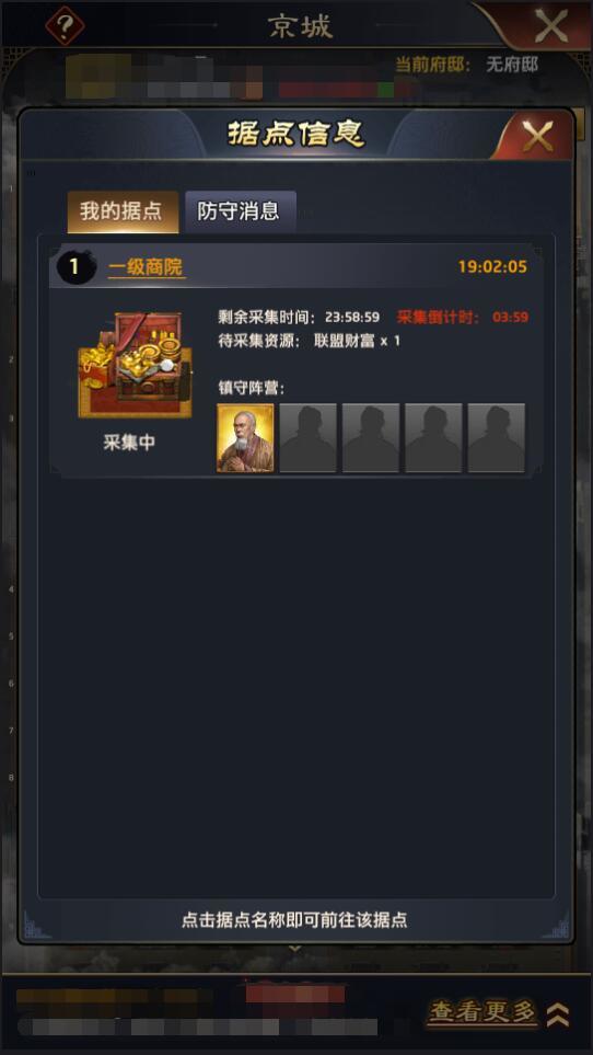 (7)占据据点后,大人可在京城的【据点信息】页面中对已占领据点所产出资源进行采集,每次采集间隔5分钟;