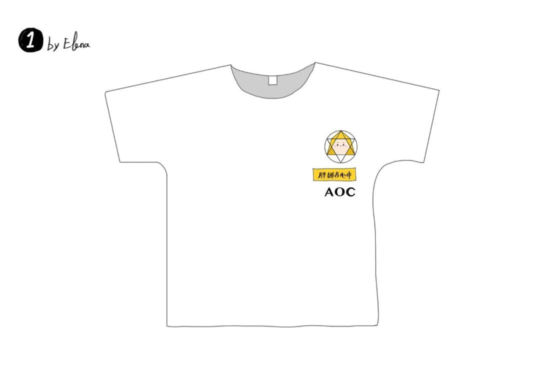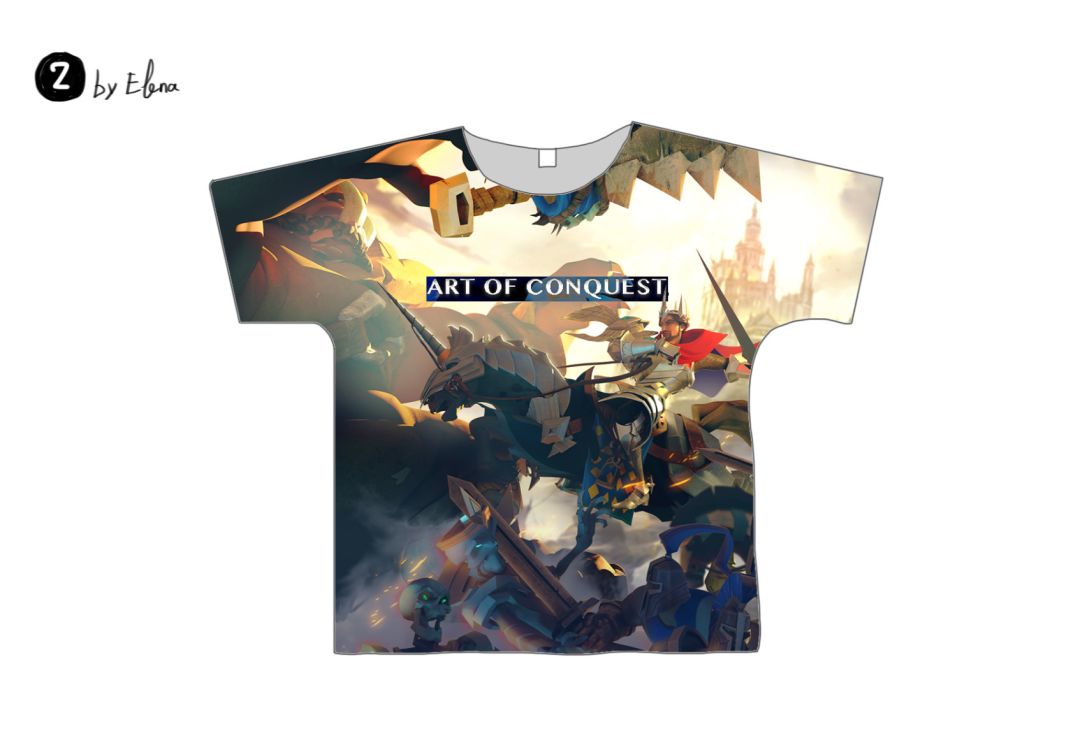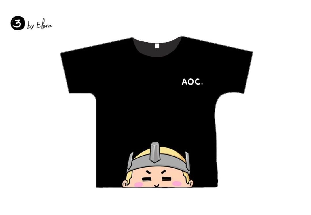 以白色T恤为基本式样,左胸设计为卡通图案,应该会设计好几款不同英雄不同文案的。AOC为Art of Conquest的缩写,剑与家园的英文名。