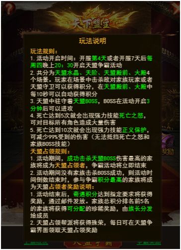 【占领判定】:活动时间结束后,在天盟殿内部积分最高的家族成为盟主家族,击杀BOSS可以提前结束活动。