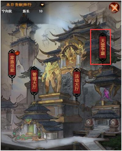 【活动入口】:家族界面的“天盟争霸”处点击可大可玩法界面,活动开启当天,主界面右侧出现“天盟争霸”。
