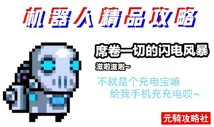 作为一个满级的机器人,当然少不了强大的输出能力,与机器人比较搭的武器也有很多,不过激光,近战,辅助这三类武器更能让机器人不费吹灰之力地拿下地牢。 首先是激光类武器,因为五星机器人自带激光加粗天赋,这使得无论是什么激光武器在机器人的手中,都像是被注入灵魂一般,在机器人手中的激光武器,通常会配合机器人的技能使用,从而达到快速清图的效果,不过有一点需要注意,加粗的激光与电流一起被释放出来后,机器人的视野将会出现很大的盲区,所以在清图之前必须要确保绝对的自身安全,当然,用这种方法打boss确实也是蛮快的,不过如果是在面对最终boss时便要考验技术了,如何能在用激光打出伤害的同时,又能用近战武器为自己创造生存空间,也是每一个机器人玩家都必定要学习的课题。 其次,近战类,机器人的技能虽然可以迅速解决多个敌方单位,但在放技能时,其自身的移动速度将得到削减,就如同无毒盾踩到了绿地板一样难受,这时如果没有一把趁手的近战武器来保护自己,那么你每次在释放技能时,都是在用命来赌,如果只是为了单纯地清理弹幕的话,这里要推荐一个白武——锤子,由于鬼才凉屋把震荡波也列入了激光类的范畴,所以攻速略快的锤子一直都深受机器人党喜爱,当然,如果要是为了打boss的话,前面的一些还可以,打3-5关boss时锤子还是差了点儿火候,如果可以的话,还是尽量要在3-5的boss战之前入手一把更厉害的近战武器来换掉锤子,例如如冰霜剑、火焰剑、棒球棒、羽毛球拍等,都是很出色的boss战武器。 最后,我要说的辅助类,其实更多的指的便是盾牌啦,如果在释放技能时使用盾牌的话,危险系数就会低很多,不过话虽如此,在3-5那种激光纵横的世界里,盾牌就略显鸡肋了,不如一把近战武器靠谱,某些脸黑的同学(我)曾经就这么吃过双龙的亏……。 ps:目前红武(除盾牌)中非常适合机器人使用的暂时似乎只有大骑士的剑,火龙步枪和沙虫,但沙虫蓝耗较高,所以如果同时携带多种有蓝耗武器时,并不建议使用。