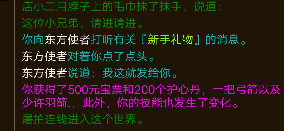 新人开局,选好天赋属性之类。先去客栈找东方使者领取新手礼包,有基础武功三种和元宝票之类。