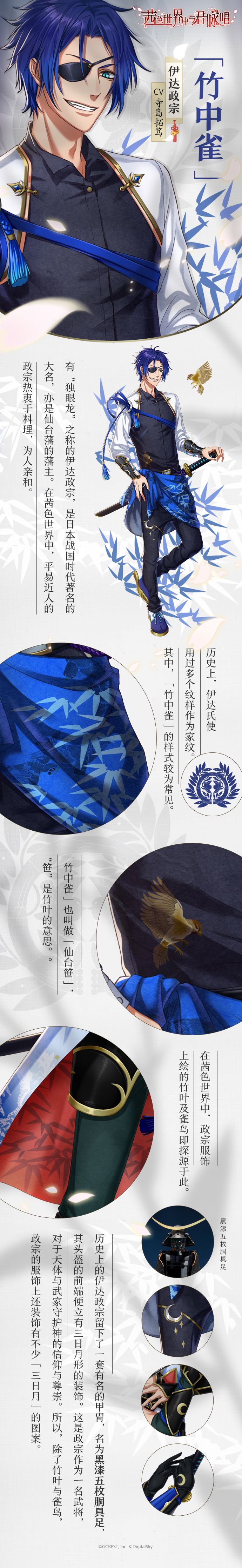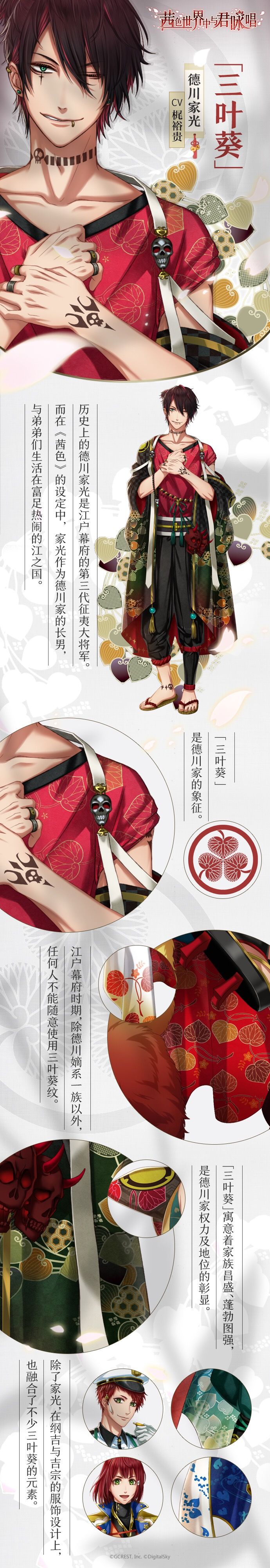 评论或话题投稿艾特@茜色世界中与君咏唱,告诉我们你最喜欢哪位月读男子服饰上的花朵纹样,如若被采纳至下期「茜色显微镜」的内容中,我们将送上茜色周边大礼包作为感谢~