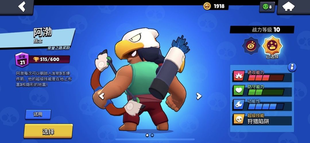 阿渤擅长远距离输出敌人,但他作为一名战士,优秀的血量使其在近距离作战时尚有一搏之力,他精细布置的隐形陷阱,将使得他的敌人在战场上如履薄冰。