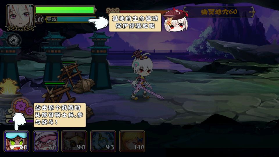 进入副本后左方位基地,基地损毁后无法复活,右方是出兵地点,没有基地无法攻破,主角和兵种只能由左向右攻击,兵种只会由左向行进,特殊兵种拥有威力巨大的技能