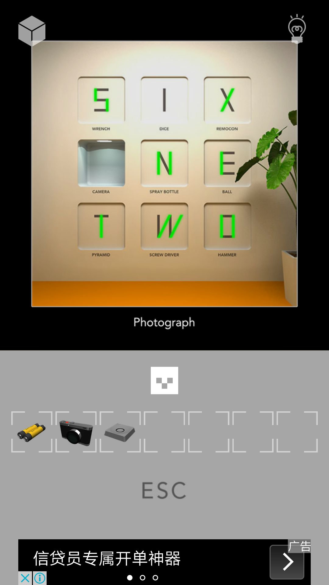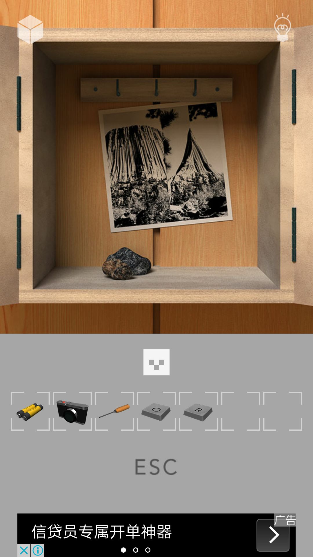 第四步:把骰子放回去,拿照相机,给它安上镜片,再后退对九工具画面拍照,如图3,可知提示4:612,再把照相机放回去,拿骰子按提示4点得钳子,把骰子放回拿相机,再去第二个房间,左转点墙上箱子用钳子剪短铁线打开可看到图4并拿到一字螺丝刀,移动左下角石头得R键。