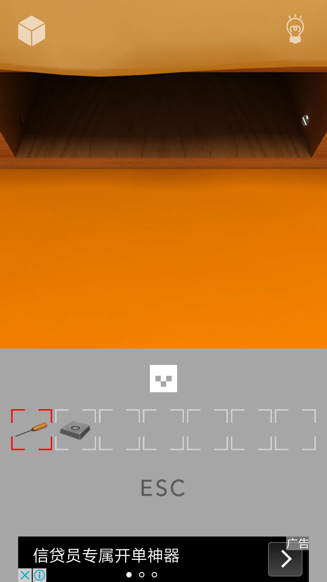 第三步:左转回九道具画面,把相机放回原来位置,再拿其下方右边的十字螺丝刀,后退右转进房间,点床下的抽屉再点中间那个拿到O键,再点下抽屉(点抽屉最外面那个圆)抽屉抽出看到两个螺丝,如图2,右边的需要一字螺丝,先点左边螺丝用十字螺丝刀拧掉,再后退点最左边抽屉打开得镜片,后退两次,点桌子再点钟可看到上面有几个点,点钟上方的白按键按四次得提示3:1,5,3,4。点钟面一下翻到背面,拿走盖子里的电池,后退回初始房间。到九工具画面,把螺丝刀放回,先拿其最上方的骰子(放大可看到翻转键),按提示3点骰子上的点数,得另一块电池。