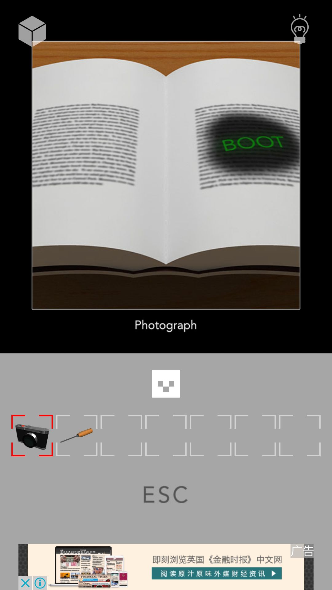 第六步:后退左转两次点书桌再点书,对右侧书用水壶,再后退回初始房间,去九工具画面放回水壶拿照相机,去第二个房间点书对翻开的书照相,得图6,这时我们回收红色保龄球 回初始房间的九工具画面,放回照相机和保龄球,拿左下角的三角石跟右下角锤子,点三角石放大用锤子砸得旋钮键和B键,左转点左边花盆把旋钮安上,转到圆标志那头,再后退去门画面右边密码盘放上B键,输入BOOT,三钥匙画面玻璃罩打开,并且道具栏里的道具都消失了,拿走三把钥匙(木头的是无名之匙,小丑帽子的是愚蠢之匙,最后一个是希望之匙)