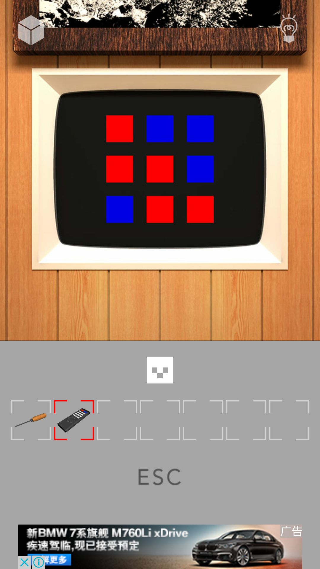 第五步:后退右转点床下中间抽屉抽出,把右边一字螺丝用一字螺丝刀拧掉,再后退开右边抽屉得钩子,后退回初始房间,去九工具画面把相机放回去,拿十字螺丝刀,再把一字螺丝刀放回去,拿右上方遥控器,点它放大翻到背面用十字螺丝刀打开,放入电池,再去第二个房间点墙上画,对它用遥控器可看到EFRE,结合图4可知正确顺序为FREE,回初始房间右转两次点门右边密码盘,放上O和R键,输入FREE,自动来到九工具画面发现画面又解放了一格,拿遥控器位置下面的红色保龄球,给它安上钩子,去第二个房间右转,给铁链放上钩球,再左转可看到画升起,对屏幕用遥控器可看到图5,后退右转两次点门左边发现上面有个眩晕标志,结合图5可得提示5:红蓝蓝蓝红红蓝红红。后退回初始房间放回遥控器拿正中间的水壶,再回第二个房间,右转两次点门左边放上水壶,按提示5按红蓝按钮,得到装满绿水的水壶。