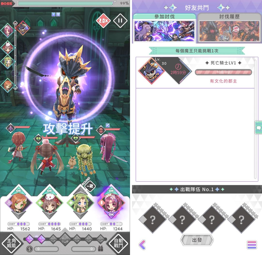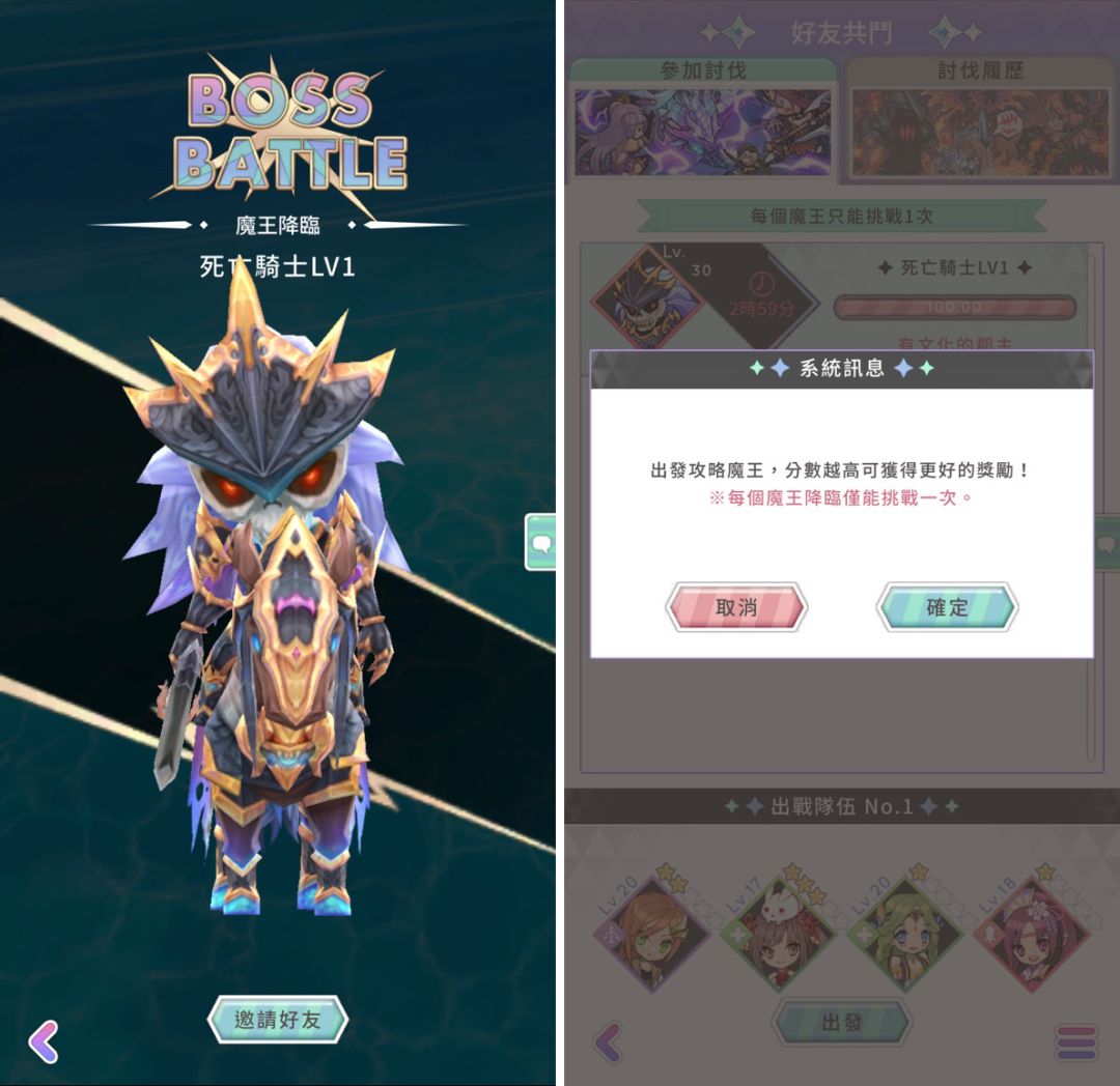 當玩家巧遇魔王之後成為【發現者】之後則可選擇五位好友前往協助攻略並獲得強化Buff,且所有好友皆可在時間歸零前進入關卡並協助攻略。要注意的是,每隻魔王都只能進行一次挑戰,所以隊伍搭配跟技能克制很重要喔。