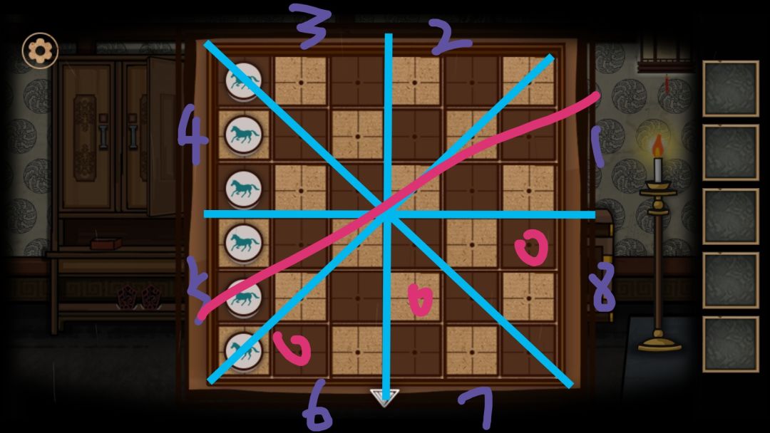 在8区域任下一枚棋子(如图,其实有三个可能位置),7区域的棋子应保证不与8区域棋子在同一行,列,斜行。还要保证7,8区域的中心对称棋子与7,8区域两棋子,一共四个棋子间两两不在同一行,列,斜行,根据蓝线规则,只需要保证7区域棋子不在8区域棋子关于\蓝线的对称\斜行即可。