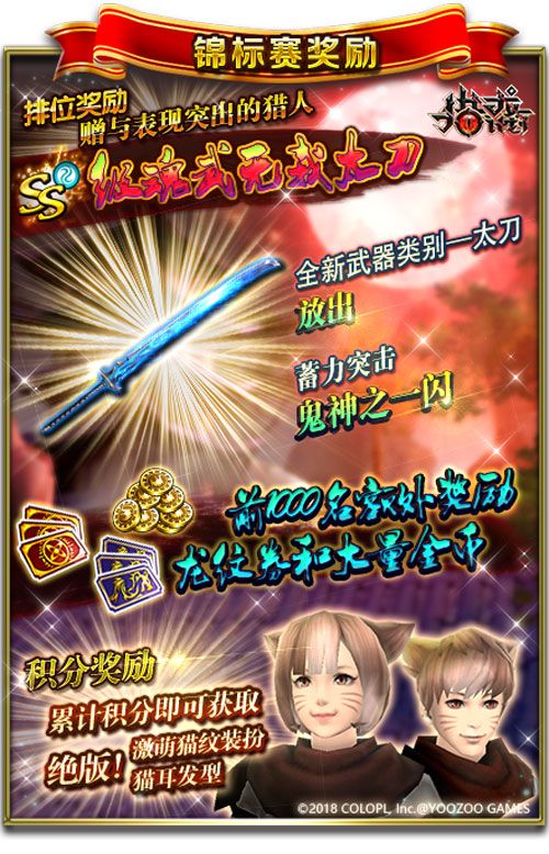 本届锦标赛活动前10名的猎人,可通过荣誉勋章兑换商店购买到新型魂武——无我太刀,这是一把超版本SS级武器,可通过蓄力突击释放技能——鬼神之一闪!前1000名猎人还会额外获得龙纹券和大量金币,更有绝版激萌猫耳发型奖励!