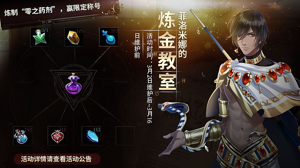 ❀活动内容❀:活动期间,每日19点至22点,每隔10分钟,野外地图(仅PVE线)将刷新若干草药用于炼金。初次炼金可获得不同药剂,药剂可再次进行炼金,成功后将获得高级炼金配方「零之药剂」以及限定称号「初学的炼金术师」。(高级炼金配方将在即将到来的资料片中上线使用)
