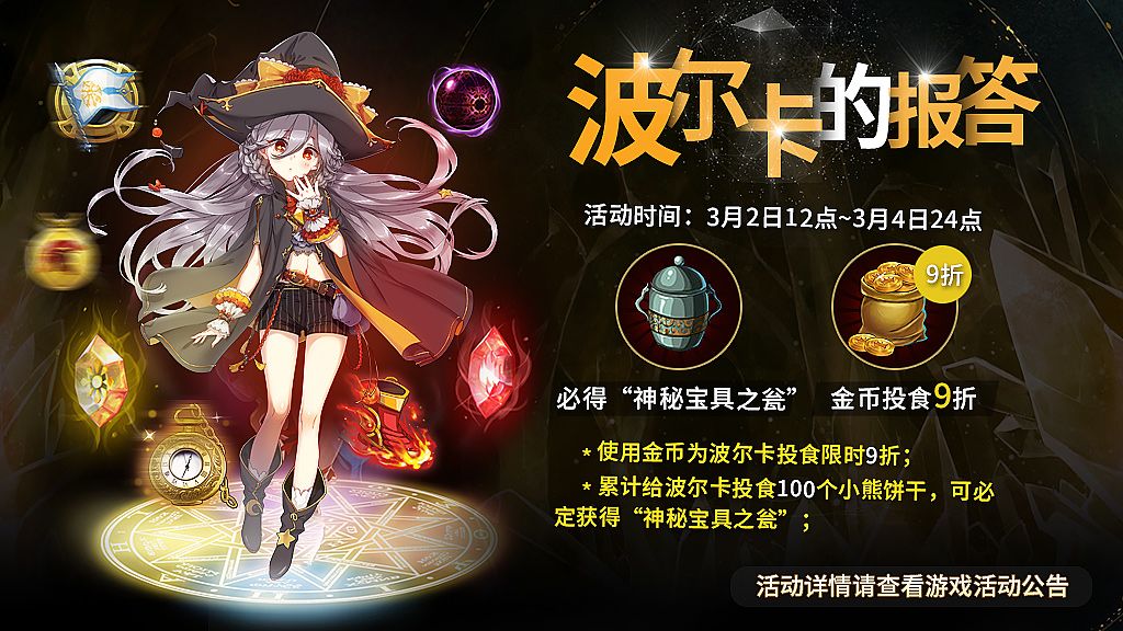 ❀活动内容❀:活动期间,使用金币为波尔卡喂食限时9折;累计给波尔卡投食100个小熊饼干,必定获得「神秘宝具之瓮」*1。