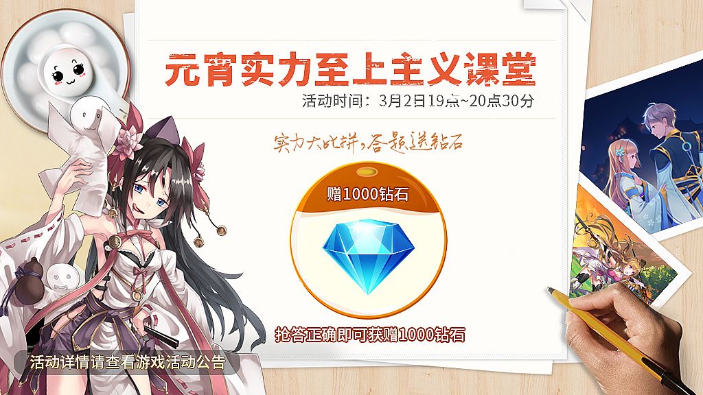 ❀活动内容❀:活动期间,每15分钟,系统将通过公告发布一道谜题,各区服第一名使用「喇叭」回答谜题且正确的玩家,将获得1000钻石奖励。