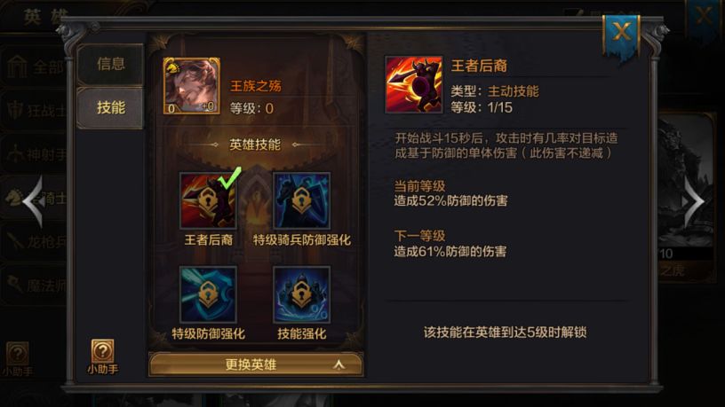 “王族之殇”的主动技能是:开始战斗15秒后,攻击时有几率对目标造成基于防御的单体伤害,15秒的战斗时间才能生效,在前期显得特别鸡肋
