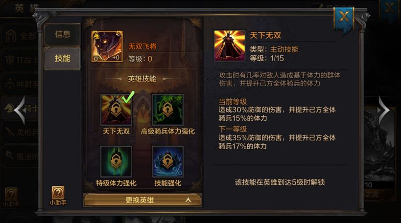 “无双飞将”的主动技能是:攻击时有几率对敌人造成基于体力的群体伤害,并提升己方全体骑兵的体力,铁骑无双