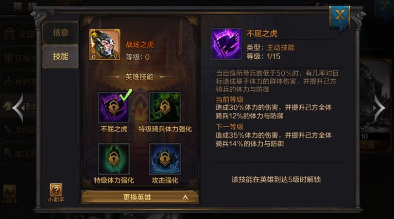 “战场之虎”的主动技能是:当自身所带兵数低于50%时,有几率对目标造成基于体力的群体伤害,并提升己方骑兵的体力和防御,当有了这个技能“战场之虎”才是真正的不屈之虎