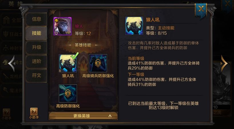 “狼人”的主动技能是:攻击时有几率对目标造成基于防御的单体伤害,并提升己方全体骑兵的防御。