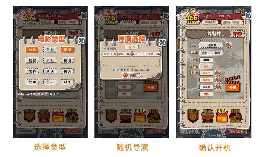 确定好投资金额后,还需确定影片名称、类型、导演、以及演员。